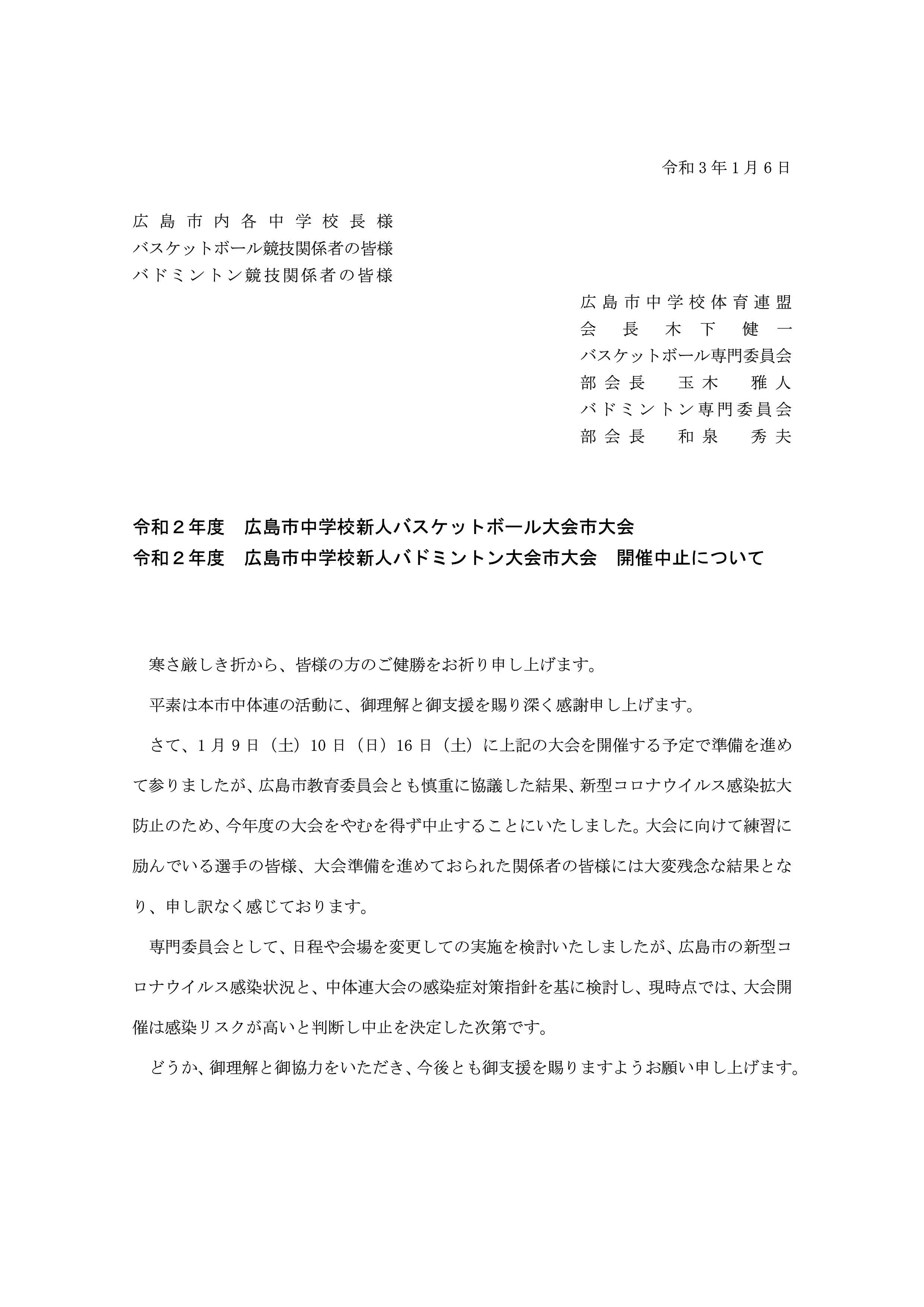 市大会は1月9日(土)から始まる予定だった大会は中止となりました。