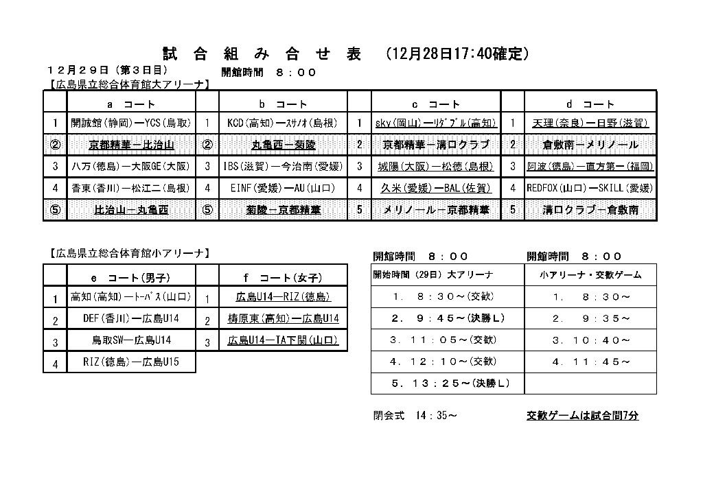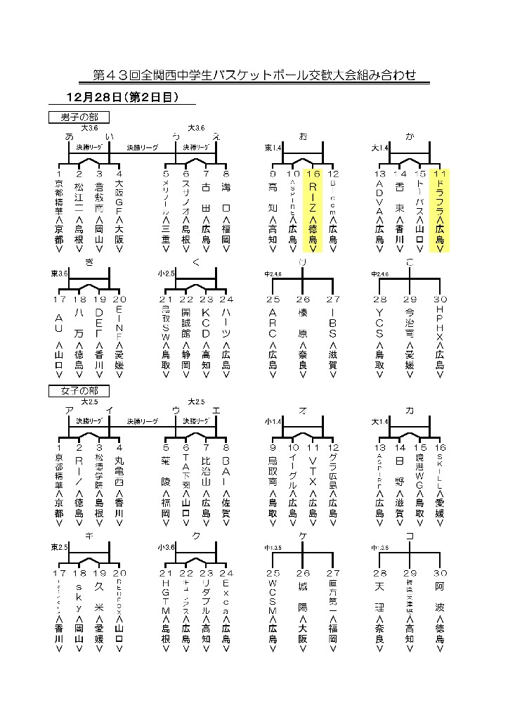 | 女子 12/12組み合わせが変更されています。必ずご確認ください。 出場チーム・大会1日目組合せと結果・大会2日目組合せと結果・決勝リーグ ※うまく表示されないときや、印刷するときには画像をクリックしてください。PDFファイルになります。 |